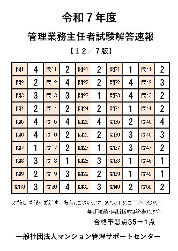 2025.12.07 お知らせkanedayuki 令和7年度 管理業務主任者試験解答速報 予想合格点は35±1点となります。 令和7年度 管理業務主任者試験解答速報 予想合格点は35±1点となります。