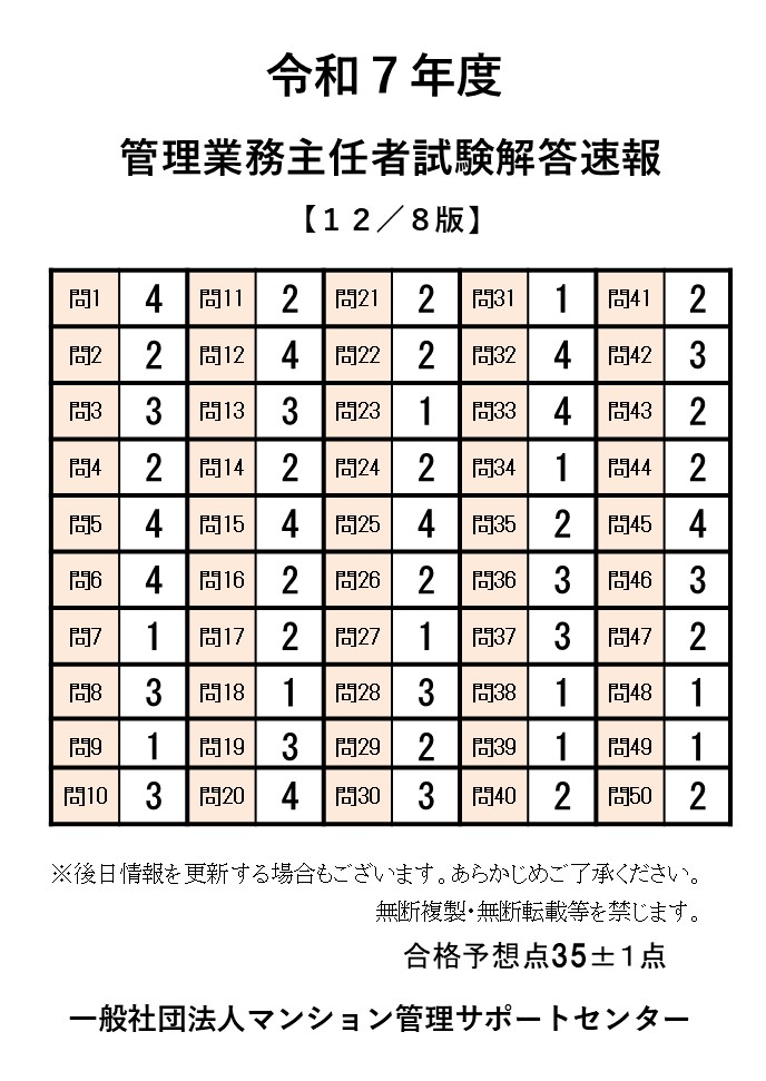 2025.12.07 2026.01.16 お知らせkanedayuki 令和7年度 管理業務主任者試験解答速報 予想合格点は35±1点となります。合格基準点は36点以上でした。 令和7年度 管理業務主任者試験解答速報 予想合格点は35±1点となります。 受験者は 14,435人、合格者は 2,832人、合格率は 19.6% でした。合格基準点は 50問中 36問正解 となりました。